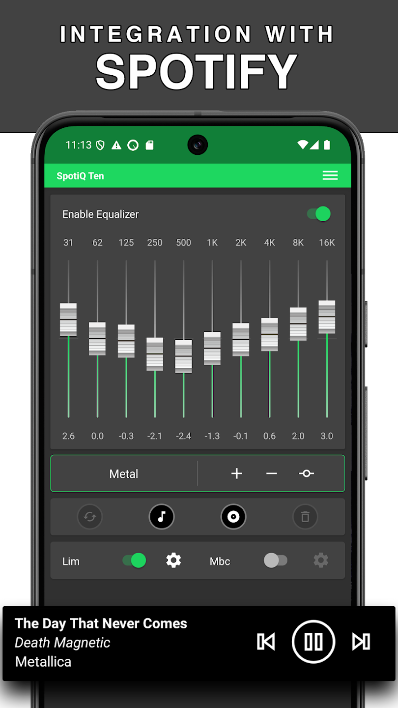 SpotiQ Ten - Equalizer Booster is a high-performance sound enhancement app designed to elevate your audio experience. Whether you're listening through headphones, Bluetooth speakers, or car audio systems, this app offers powerful features to boost sound quality. With its 10-band equalizer, volume amplifier, and bass booster, SpotiQ Ten transforms your music and videos, offering a more dynamic and richer sound profile. Perfectly integrated with Spotify, it allows for a tailored listening experience that audiophiles and casual listeners alike will enjoy.