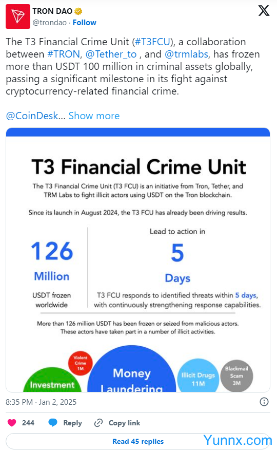 The T3 Financial Crime Unit was started to collaborate on combating illicit activity related to USDT on the TRON blockchain. The T3 FCU monitors transactions on the TRON blockchain, analyzing millions of transactions across five continents.