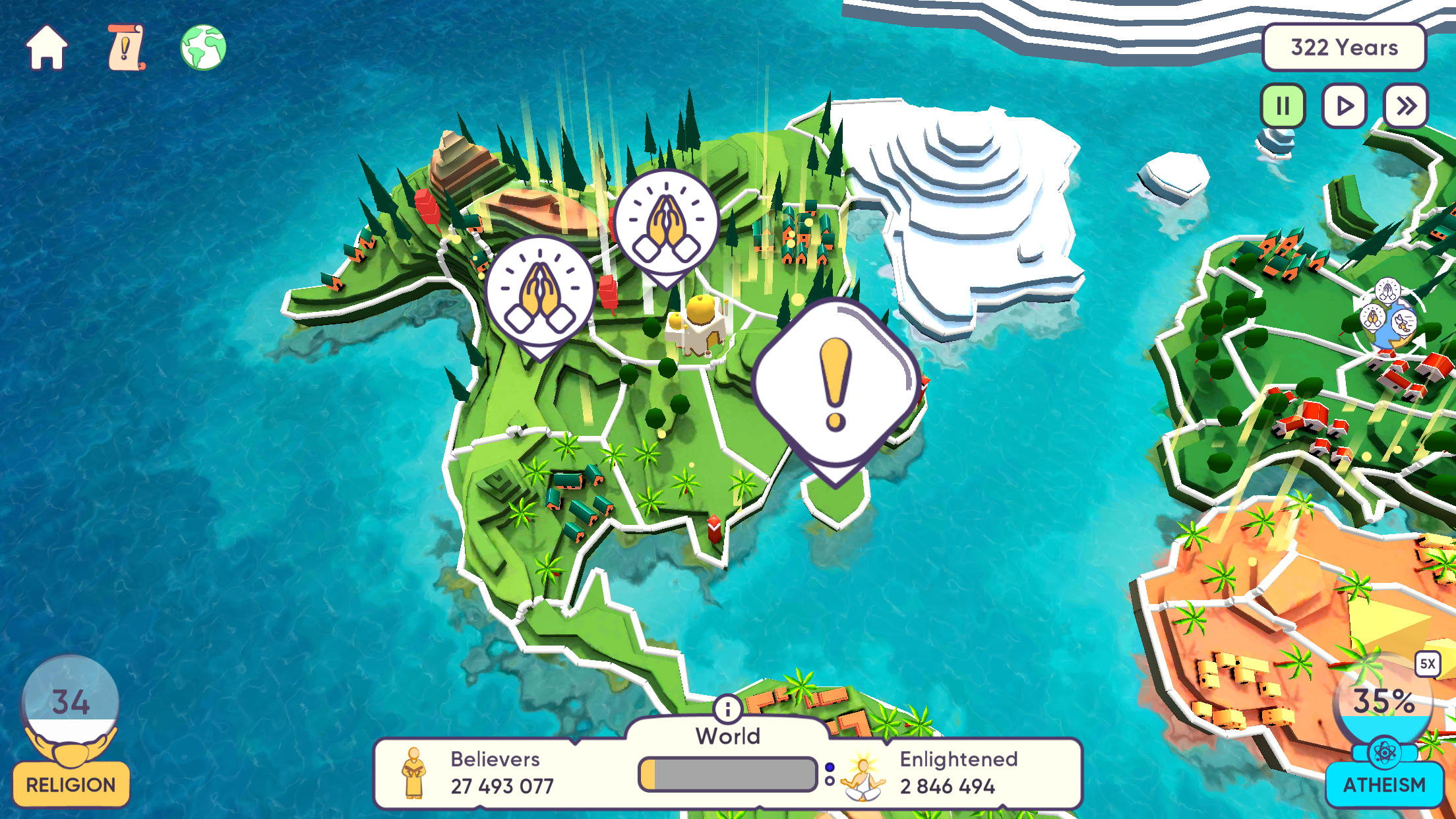3. Observational Gameplay: Observe daily activities and transitions in religious development, strategically utilizing resources and opportunities to further your goals.