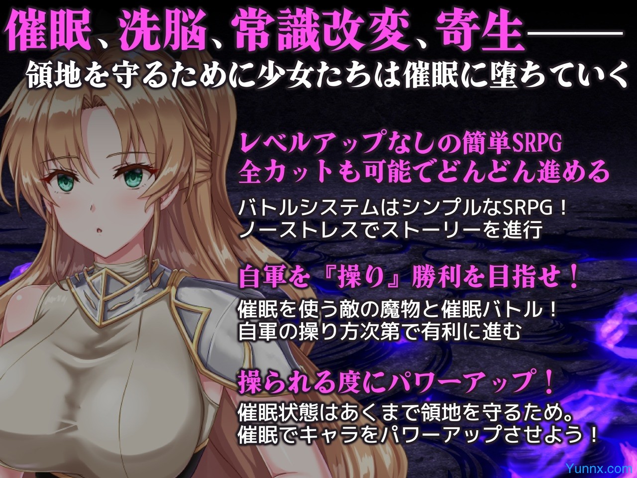 Shinmai Ryoushu Lindis no Saimin Senki is a strategy RPG featuring brainwashing and instant seduction elements. As Lindis, a young lord, you must defend your territory from rebellious monsters with hypnotic powers. Battling both manipulation and external threats, Lindis must protect her people while grappling with control.