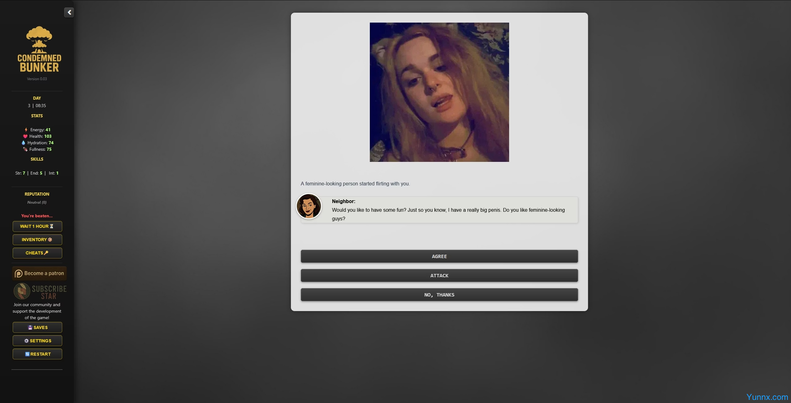 Step into the grim world of Condemned Bunker, a compact yet intense 18+ survival experience set in a post-nuclear shelter. Players must scavenge for resources, manage dwindling supplies, and navigate volatile relationships with fellow survivors. Each day brings new threats—from starvation to betrayal—in this replayable tale where every choice shapes your fate. Will you endure or succumb to the chaos?