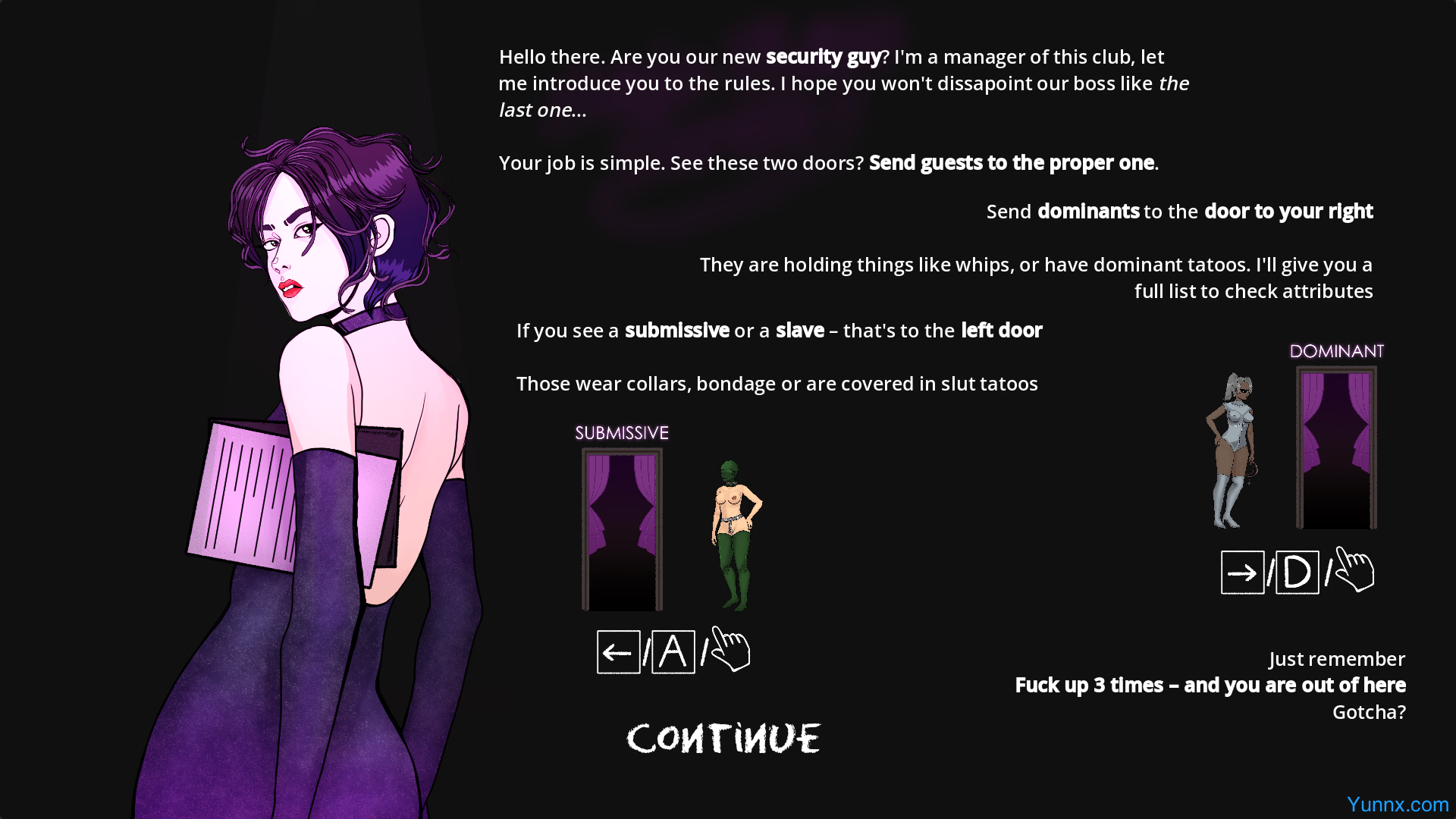 Step into the role of a nightclub security guard in Sado-Maso Sorting, an arcade puzzle game where BDSM traits define the rules. Evaluate guests based on their appearance—like bondage gear, whips, or chastity locks—and direct dominants or submissives to the correct doors. Avoid mistakes to climb the leaderboards, unlock steamy story photos, and discover all combinations of kinky clientele in this high-stakes sorting challenge.