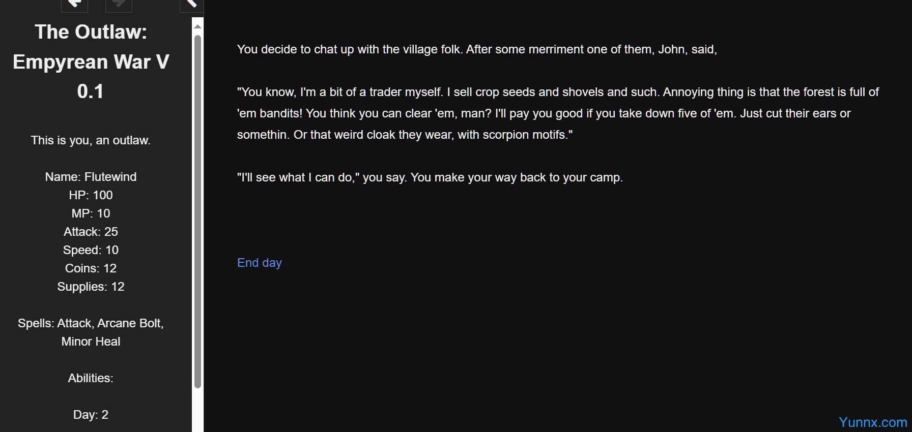 The Outlaw: Empyrean War is a captivating fantasy RPG built using the Twine engine, blending engaging storytelling with intuitive, strategic combat. You start as an ordinary individual in the Kingdom of Walshemia, only to be wrongfully imprisoned by the powerful Church. After escaping, you take up the mantle of an outlaw, driven by a thirst for vengeance and truth. The game offers players the freedom to explore, fight, and uncover the kingdom's deepest mysteries while encountering rich characters and dark forces.
