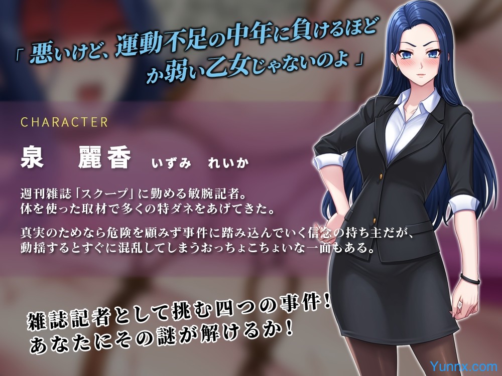 The Courageous Reporter: As Reika Izumi, you are a star journalist for the weekly magazine "SCOOP". While committed to the truth, you also have a clumsy side that can lead to trouble.