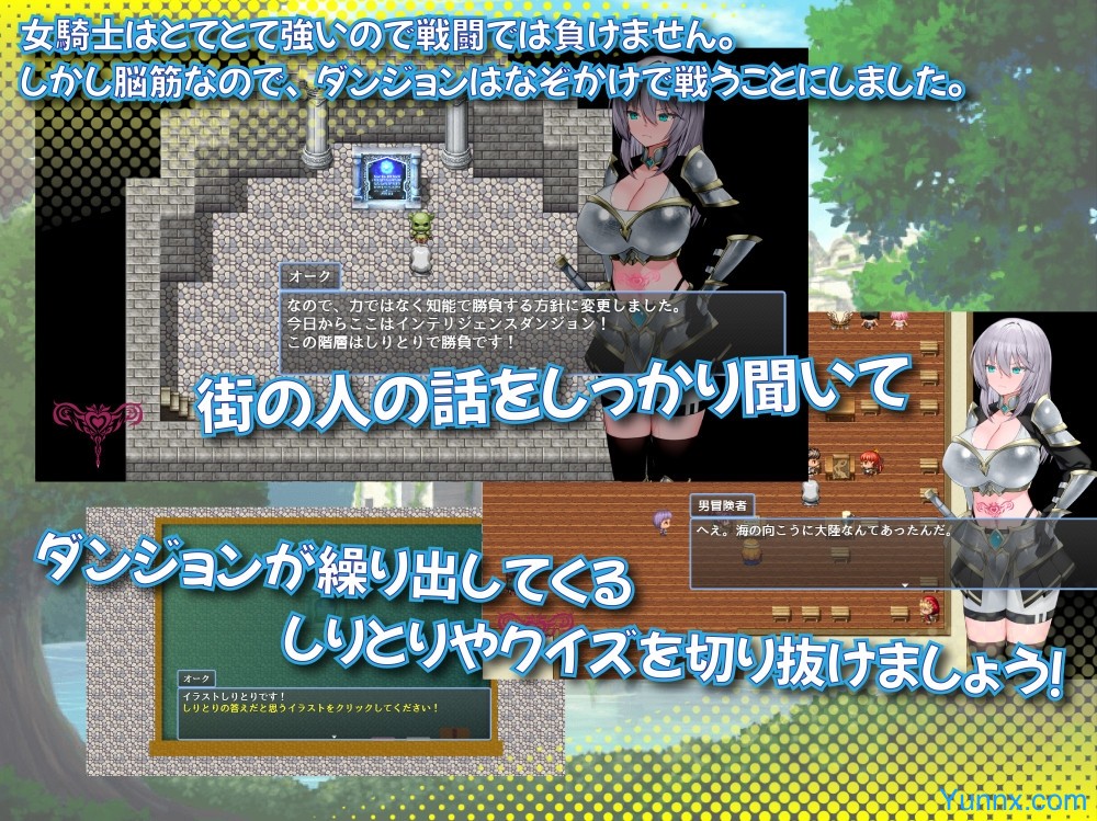 The Female Knight with a Lewd Mark on Her Stomach follows the story of Irena, a formidable warrior branded with a mystical seal after slaying a dragon. This "blessing" grants her immense strength but also subjects her to uncontrollable urges that affect everyone around her. As she explores towns and dungeons, players can engage in public exposure, solve riddles, and navigate risqué encounters while managing her arousal gauge. With its blend of exploration, puzzle-solving, and adult-themed mechanics, the game offers a provocative twist on the classic RPG adventure .