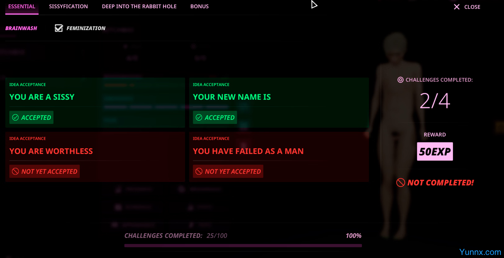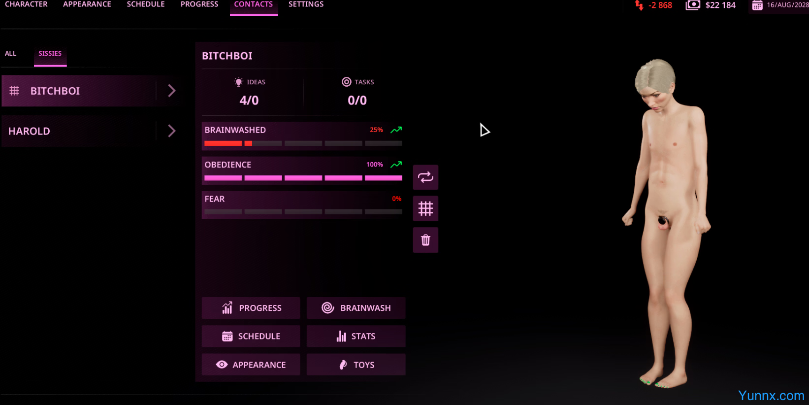 3. The Conversion Process: Track progress through a hidden “sissification” bar. Successfully get them to wear feminine attire, adopt new speech patterns, or perform humiliating tasks to complete their transformation.