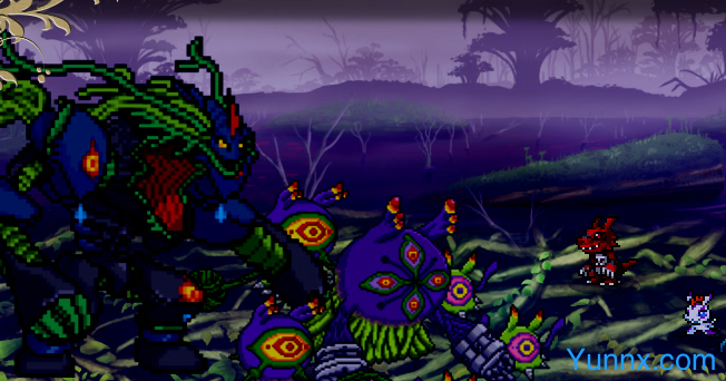 1. Pixel-art visuals reimagine classic Final Fantasy environments with Digimon-inspired chromatic effects, where spell animations evolve alongside Digivolution stages.