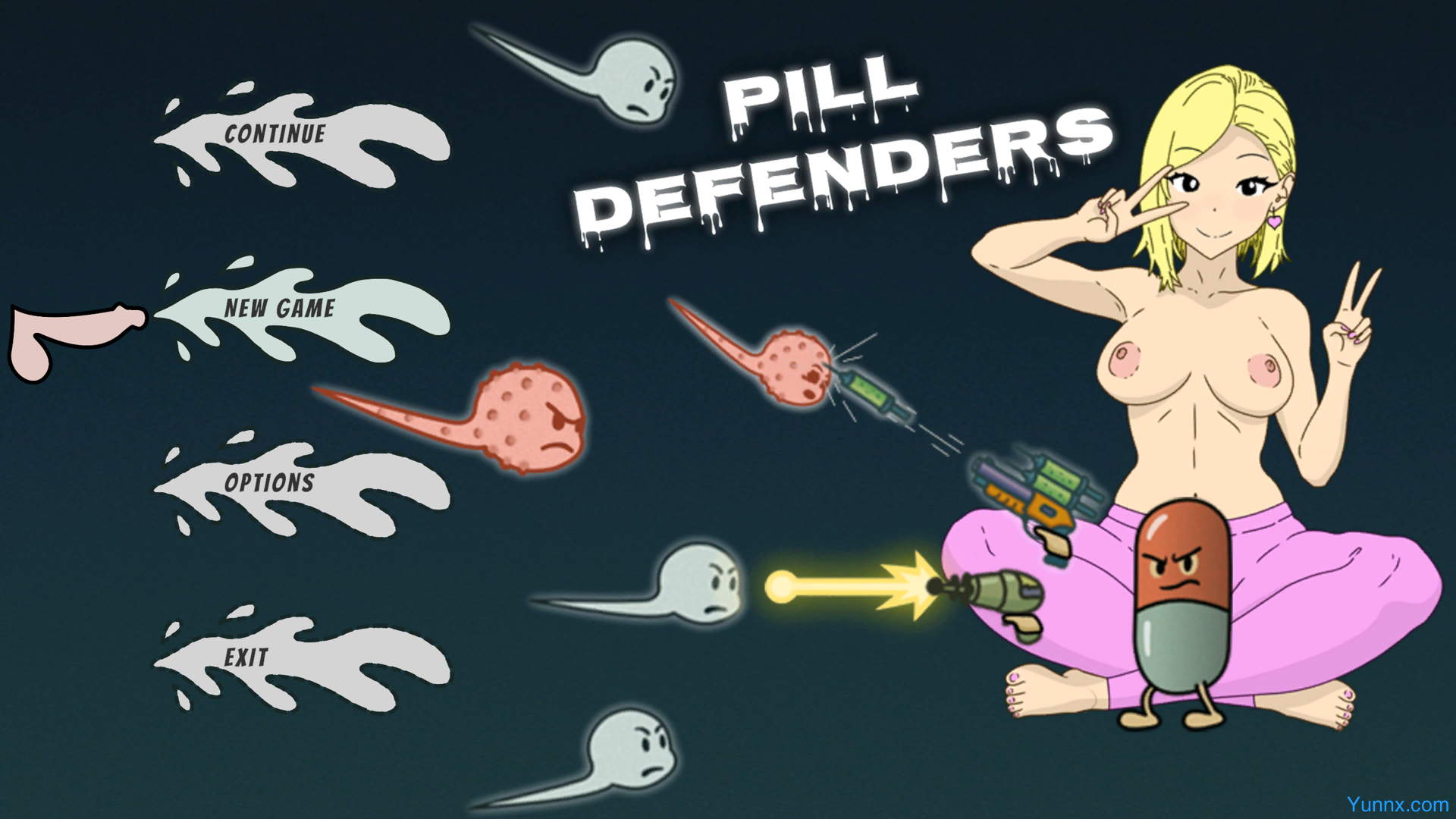 1. Engage in non-stop top-down arena combat against waves of sperm enemies, each with distinct behaviors and attack patterns that demand quick reflexes and adaptive strategies.