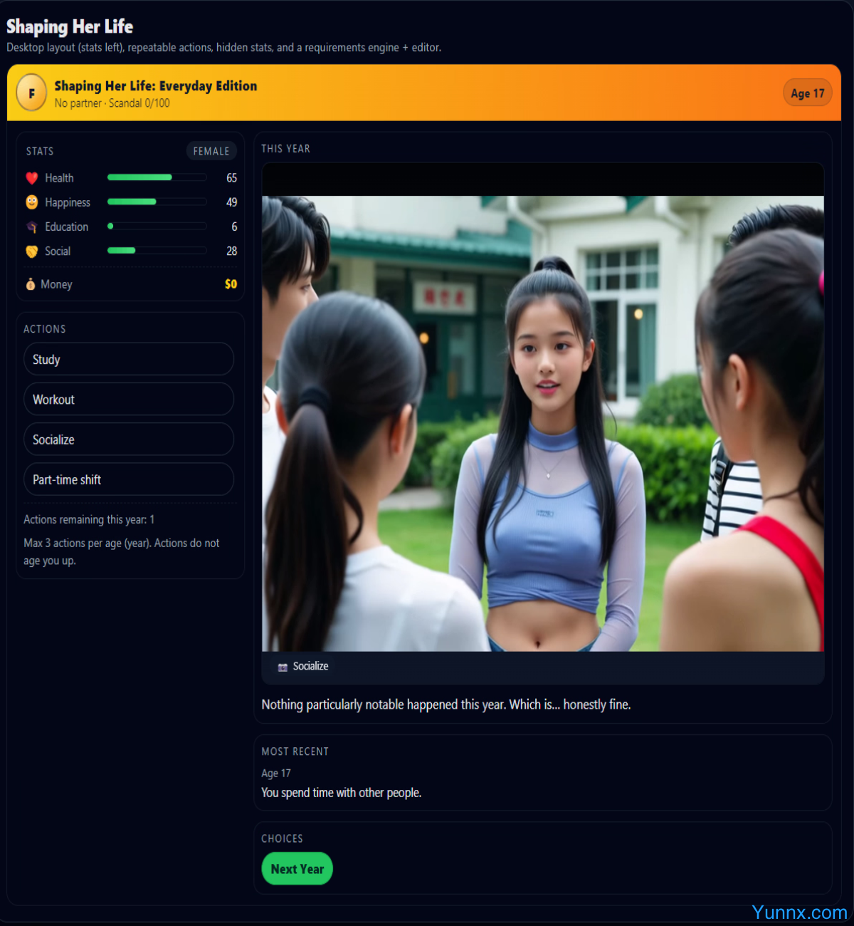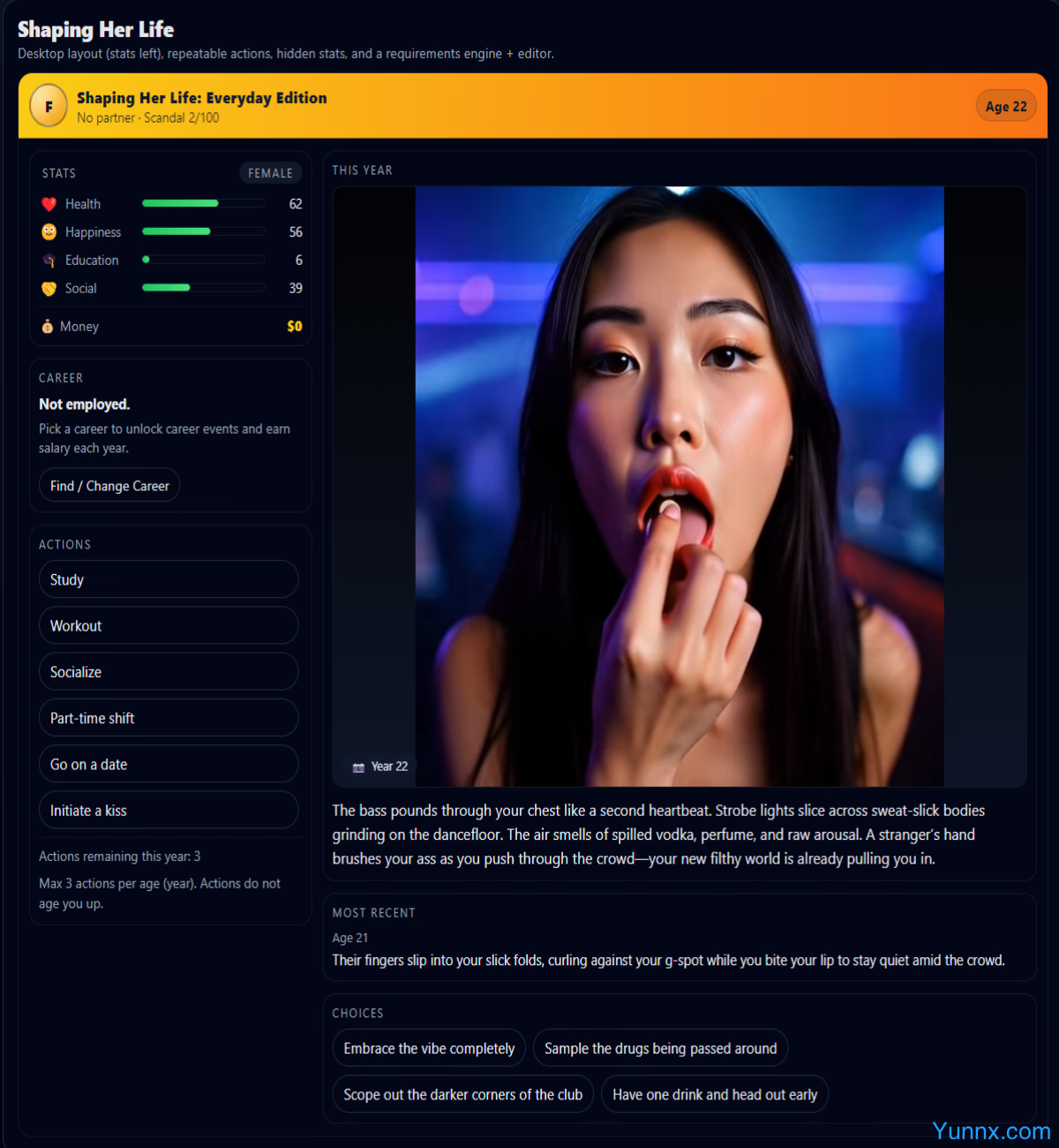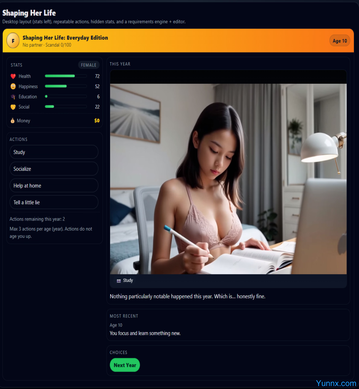 Shaping Her Life immerses players in a poignant life simulation where every choice molds a woman’s journey from childhood to adulthood. Navigate career crossroads, volatile relationships, and moral dilemmas in a world where innocence can unravel into corruption. Your decisions don’t just shape her destiny—they weaponize her vulnerabilities.