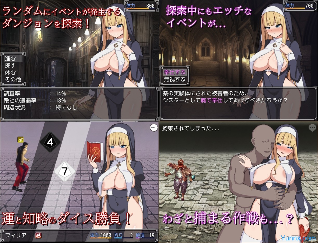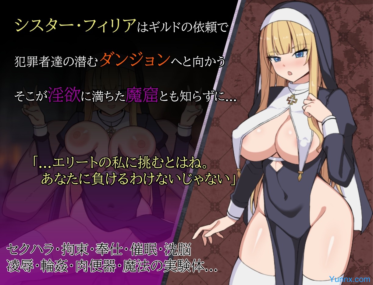 Sister Filia, a holy warrior of the Guild, accepts a mission to purge a den of dangerous criminals. Yet the dungeon she enters is saturated with a ancient curse that nullifies her divine magic, leaving her defenseless. Trapped and weaponless, Filia becomes the prey of brutish bandits, a twisted pharmacist, and a mysterious cult, each with their own depraved designs. Can she conquer the dungeon, or will she be conquered by it?