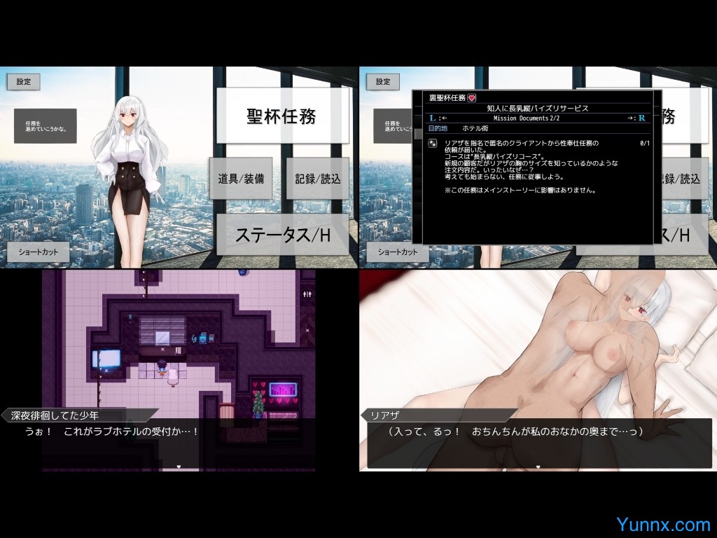 Enter the thrilling world of "Holy Grail City," where players follow the alluring Reaza Ialeng, a silver-haired company president, as she navigates bizarre incidents alongside her stunning companions, Eugen and Dechico. Customize your male protagonist to participate in intense encounters, infiltrate casinos, and undertake secret "Dark Grail Missions" in this erotic adventure set in modern-day Japan.