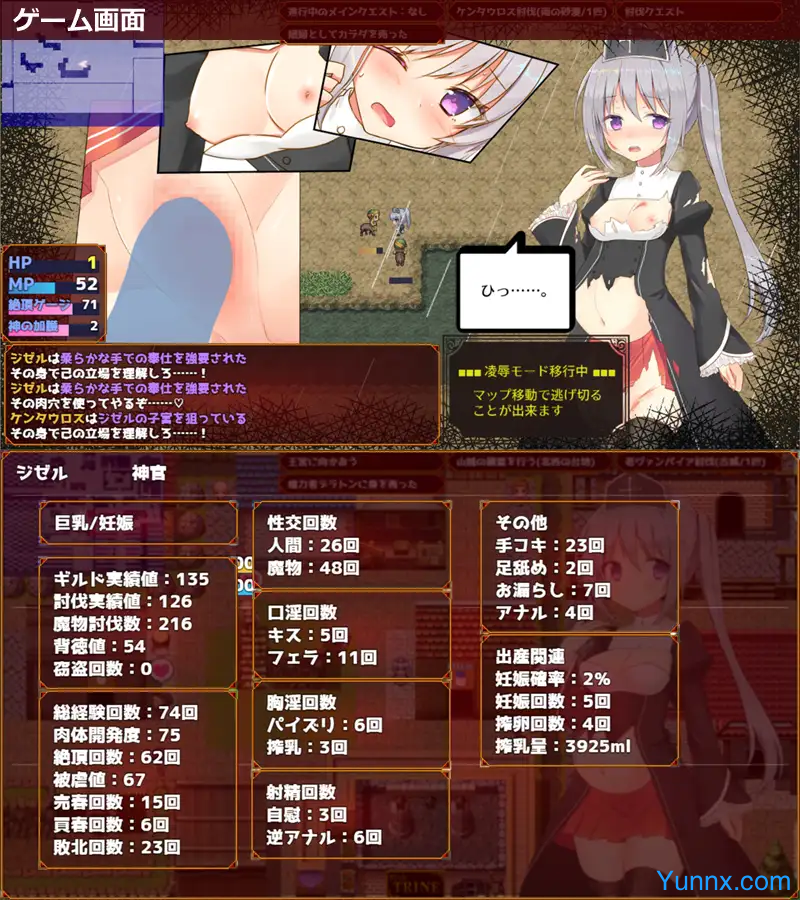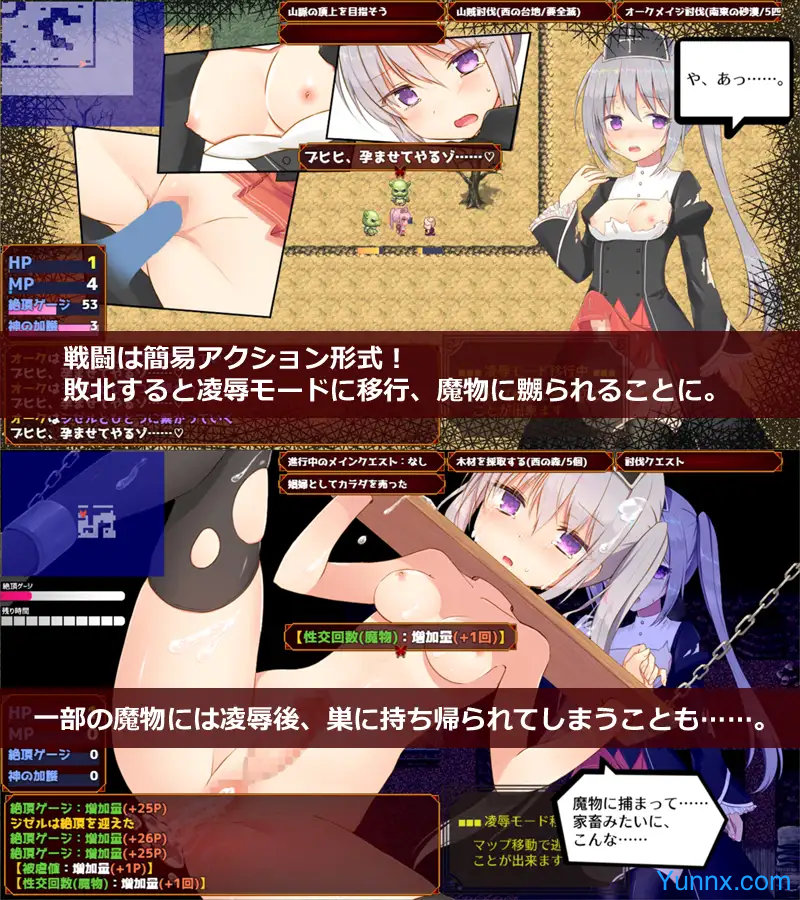 Unique Combat & "R*pe Mode": The game features an intense combat system where Giselle can fight against enemies and monsters. However, when death is imminent, the game shifts to a "rape mode," where Giselle is violated by her foes before being respawned. This feature plays a significant role in how the narrative evolves and unlocks various endings.